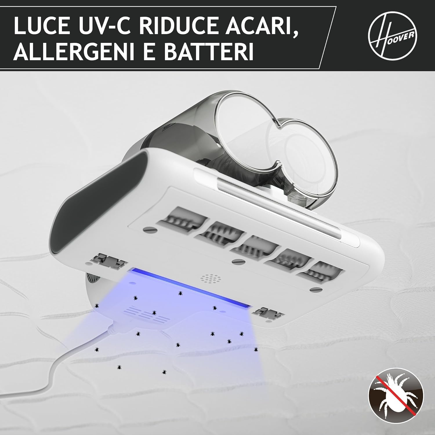 Hoover Battimaterasso HMC5, 4 Funzioni Automatiche: Battitura, Aspirazione, Lampada UV e Asciugatura, Leggero specificamente per l’eliminazione degli acari della polvere, ideale per letti, divani